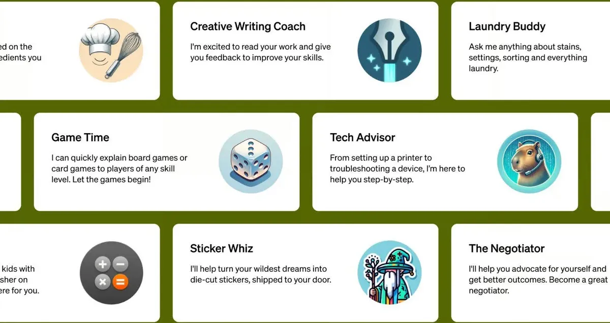 OpenAI в ноябре 2023 года представила специальный конструктор чат-ботов GPTs, с помощью которого пользователи могут персонализировать свою версию ChatGPT, наделив ее специфическими знаниями и навыками. Компания выпустила и первые примеры таких помощников — это бот для стирки, тренер по креативному письму, техконсультант и генератор стикеров.