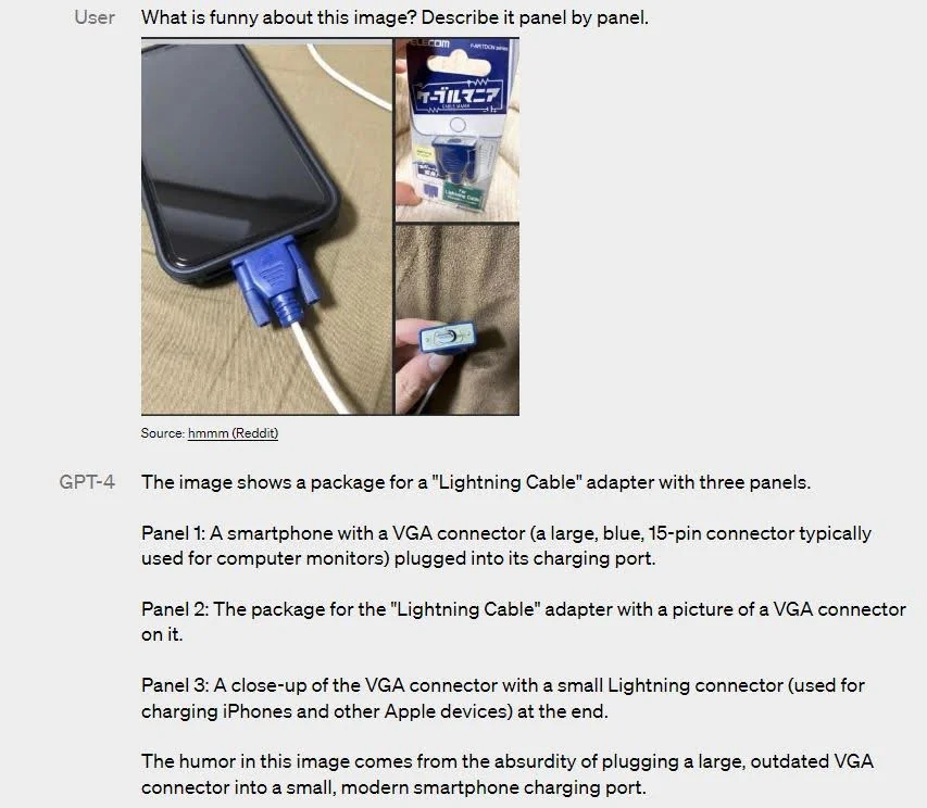 В марте 2023 года OpenAI выпустила мультимодальную модель GPT-4. Это был первый ИИ, способный обрабатывать входящие запросы разного формата, а затем выдавать текстовые ответы. Модель принимает информацию в виде текстов, изображений и видео, а также способна работать с документами, в которых есть текст с фото, диаграммами и скриншотами. Она выдает ответы в виде текста, программного кода или формул. ИИ распознает картинки так же точно, как и тексты, анализируя общее содержимое и отдельные детали. Он способен решать и прикладные задачи: например, если прислать фотографию содержимого холодильника, то ИИ предложит рецепты блюд, которые можно приготовить.