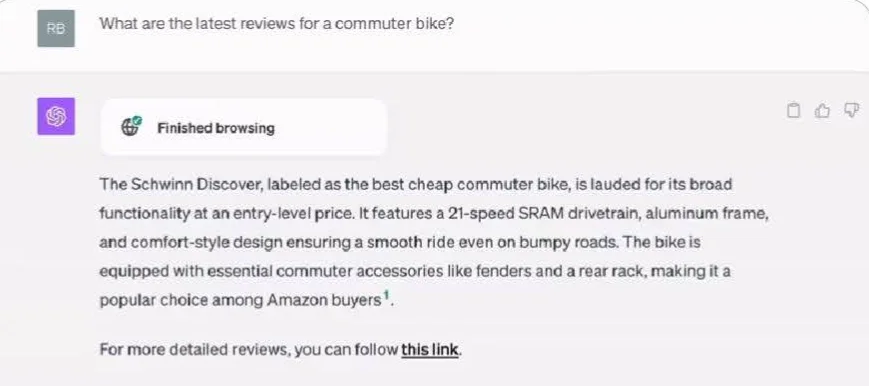 В марте вместе с анонсом модели GPT-4 OpenAI объявила о новых готовящихся функциях чат-бота ChatGPT — в том числе о функции поиска актуальной информации в интернете. До этого чат-бот оперировал знаниями, датированными 2021 годом и ранее. С марта он начал поддерживать плагины, предоставляющие пользователям доступ в интернет. В июне OpenAI добавила опцию поиска в официальное мобильное приложение ChatGPT на базе поисковика Microsoft Bing, однако она была доступна только платным пользователям с активной подпиской ChatGPT Plus. В сентябре компания объявила, что функция поиска теперь доступна и в самом ChatGPT, при этом чат-бот начал выдавать информацию с прямыми ссылками на источники. В октябре эту опцию сделали доступной для всех пользователей. Однако пока знания ИИ ограничены апрелем 2023 года.