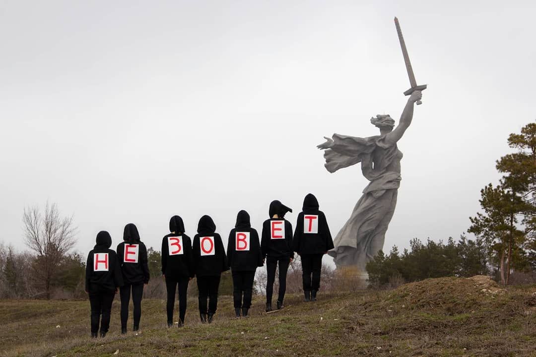 В марте 2022 года антивоенная арт-группа praematerna опубликовала фото со своей акции в Волгограде: участницы стоят на фоне «Родины-матери», созданной скульптором Евгением Вучетичем, спиной к камере, на спине каждой — по букве, вместе они составляют слова «Не зовет». В акции нет критики самого монумента и попытки нарушить его цельность. Участницы арт-группы только используют его как популярный символ, повод для разговора.