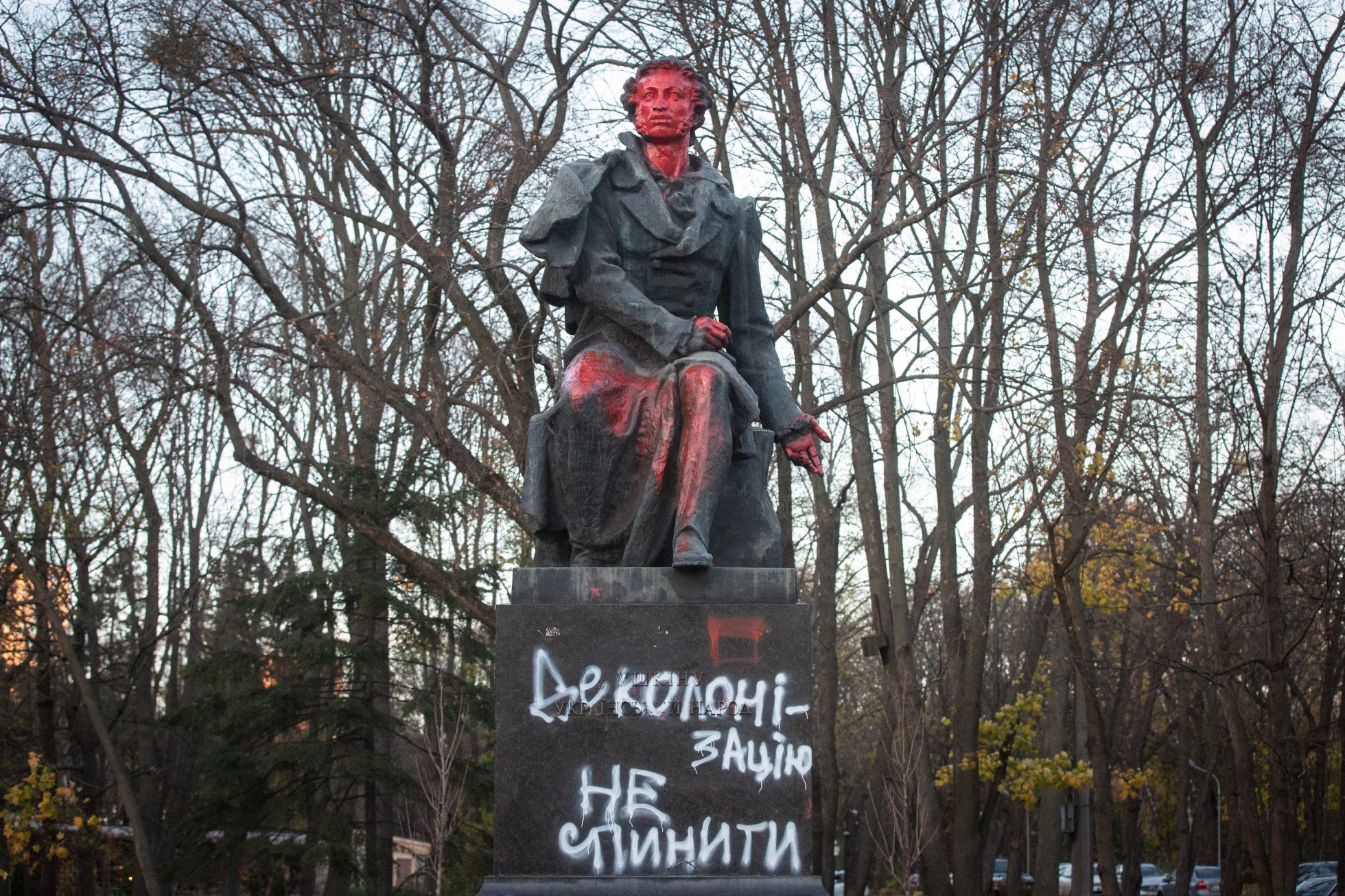 Сносят в Украине и памятники Александру Пушкину — в 2022-м скульптуры поэта начали массово демонтировать по всей стране. Среди прочих снесли и старейший киевский памятник Пушкину 1899 года. В День украинской письменности и языка 27 октября 2023 года другого киевского Пушкина переодели в российского пленного. На постаменте написали «Деколонизацию не остановить», а самому поэту завязали глаза.