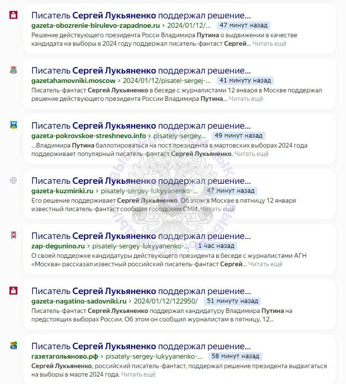 — Тем временем районные газеты, которые финансируются из бюджета Москвы, написали новость о том, как писатель Сергей Лукьяненко поддержал участие Путина в выборах президента, — заметил телеграм-канал «Выборы, всем ЦЫК!» в пятницу 13 января.
