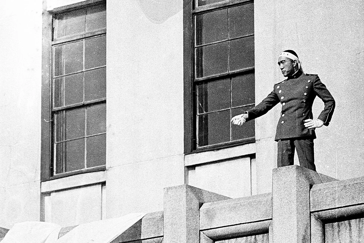 25 ноября 1970 года Юкио Мисима отправил редактору рукопись заключительного романа тетралогии «Море изобилия». Тем же утром, облаченный в мундир «Общества щита» и со старинным самурайским мечом на боку, писатель вместе с группой единомышленников явился на базу сил самообороны в Итигае и взял в заложники ее коменданта. Вскоре Мисима обратился к военным с пламенной речью против действующей власти и конституции, принятой после поражения во Второй мировой. Впечатления оратор не произвел, тем более что его слова заглушал шум полицейских вертолетов. В ответ летели оскорбительные выкрики. Желающих ввязываться в его авантюру не нашлось. Следом «лишившийся чести самурай» с троекратным «Да здравствует император!» вспорол себе живот. Премьер-министр Японии объяснил отчаянный поступок Мисимы не мудрствуя: «Да он просто свихнулся».