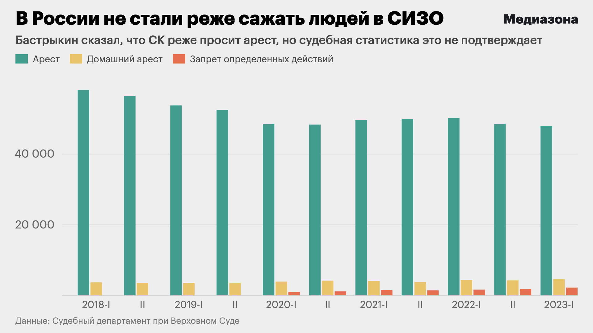 Утверждение главы СК не согласуется с общими данными по всем ведомствам, которые регулярно публикует Судебный департамент при Верховном суде. Количество рассмотренных ходатайств о первичном избрании меры пресечения в виде заключения под стражу стабильно и на протяжении последних лет таких материалов было около 50 тысяч в каждом полугодии.