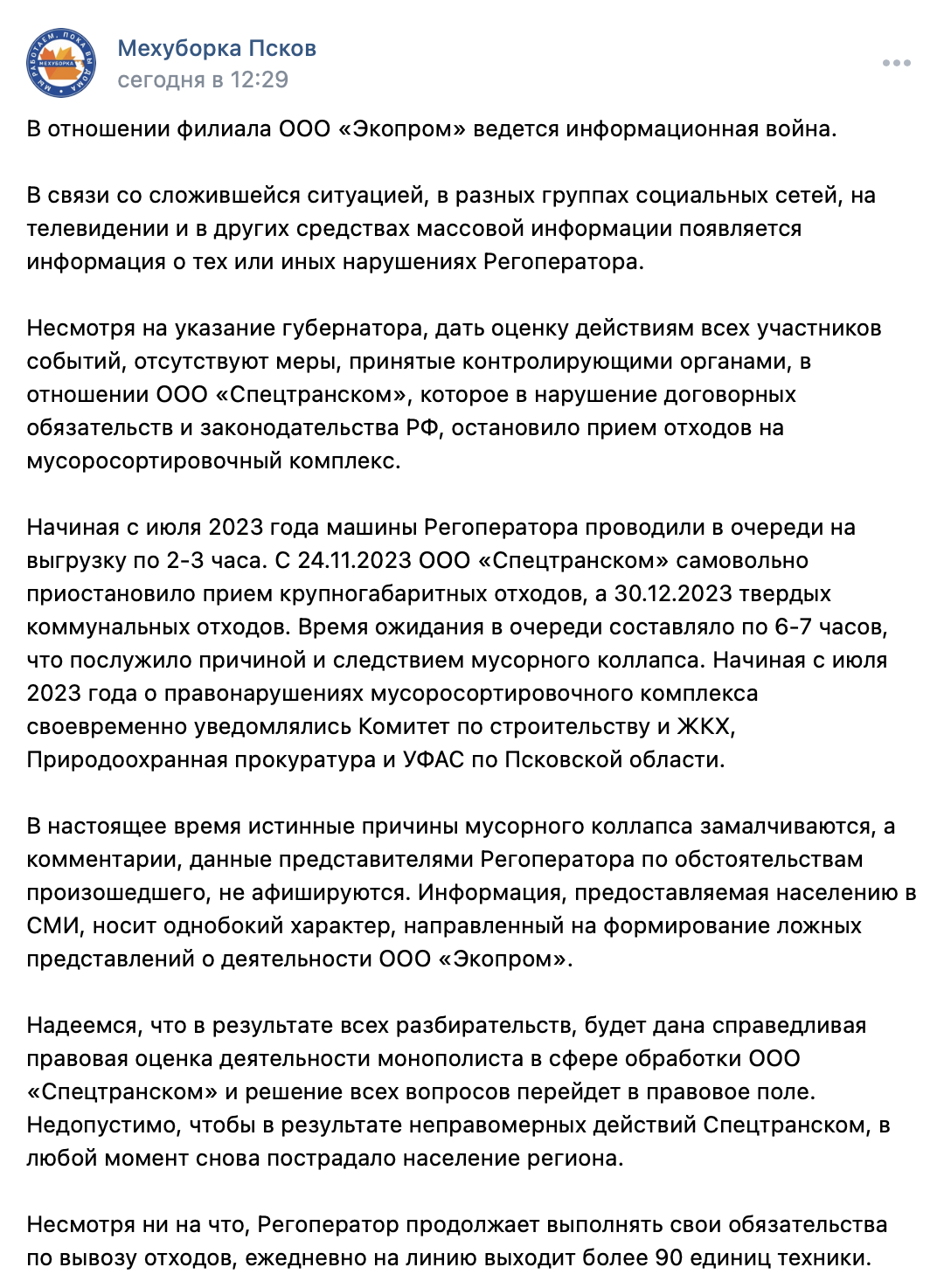 Регоператор по обращению с ТКО — ООО «Экопром» — считает, что в отношении филиала ведётся информационная война, а истинные причины мусорного коллапса в Пскове замалчиваются: официальный комментарий регоператора опубликован на странице компании в соцсети «ВКонтакте».