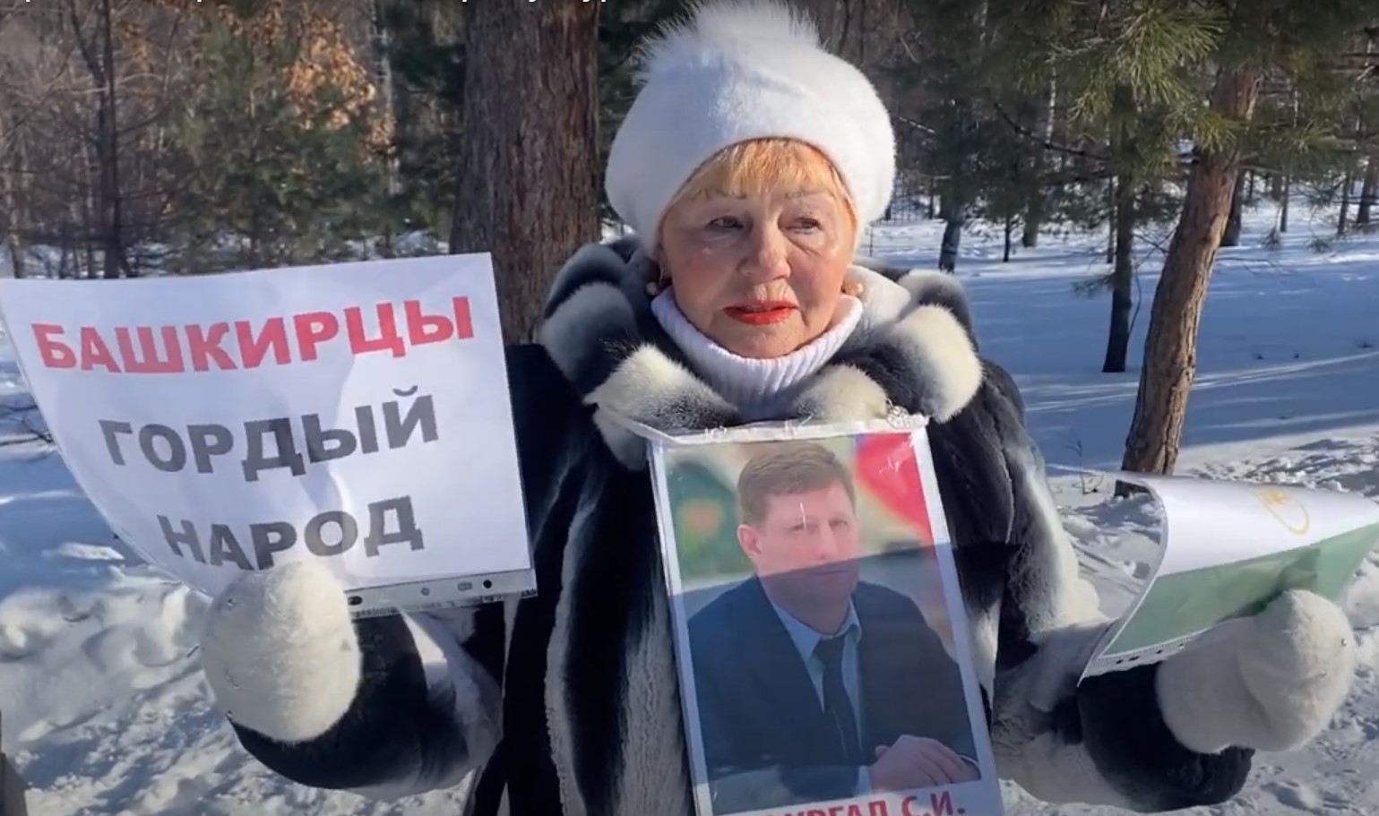 "Я сегодня вышла поддержать башкирский гордый народ. Я вышла с вашим флагом, я полностью душой болею за вас, я поддерживаю вашего Фаиля Алсынова за его позицию. Я не башкирка, но я видела речь его жены – это настолько порядочные люди… я плакала вместе с ней, когда она говорила про своего мужа <…>. Я видела [на протестах], там были женщины, пожилые женщины, которые хотят сохранить свое глубинное наследие. Свободу Фаилю, свободу всем политзаключённым! Душой мы с вами! Боритесь!", – сказала одна из участниц массового пикета.