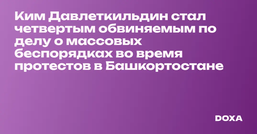 Житель Баймака Ким Давлеткильдин стал четвертым обвиняемым по делу о массовых беспорядках во время протестов в Башкортостане. Его жена сообщила, что Давлеткильдина пригласили на разговор в МВД 19 января. После этого его задержали и отвезли в Белорецк. На следующий день у него дома прошли обыски. По словам жены обвиняемого Юлии, Давлеткильдину вменяют статью об участии в протестах в поддержку активиста Фаиля Алсынова.
