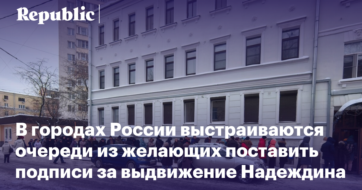 В российских городах и за границей выстраиваются огромные очереди из желающих поставить подписи за выдвижение Бориса Надеждина в президенты РФ. Он единственный демократический кандидат, который называет себя принципиальным противником политики Владимира Путина и открыто выступает против войны в Украине. Надеждина поддерживают лидеры общественного мнения, в том числе Михаил Ходорковский, соратники Алексея Навального, журналист Алексей Венедиктов, блогеры Максим Кац и Майкл Наки, политолог Екатерина Шульман, несостоявшаяся кандидатка в президенты Екатерина Дунцова и другие. Штабы кандидата в регионах сталкиваются с противодействием — есть примеры, когда сторонникам Надеждина запрещают собирать подписи. Эксперты отмечают, что сам факт сдачи подписи за него превратился в форму легального протеста. Republic рассказывает об этом подробнее.