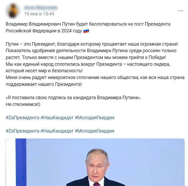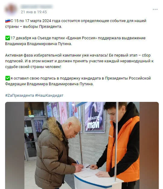 При этом несколько пользователей «ВКонтакте», опубликовавших такие посты, заявили «Новой-Европа», что поставили подпись в общественном месте и что действительно поддерживают Владимира Путина.