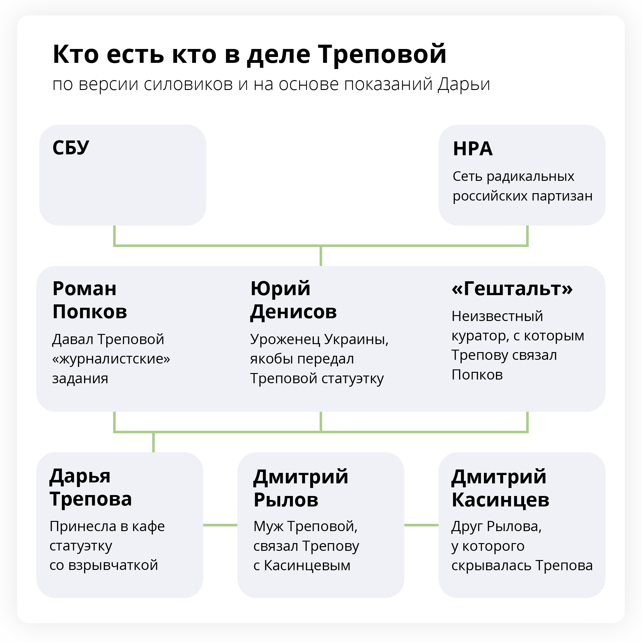 Дарья Трепова с первого дня задержания не соглашалась с обвинениями в организации теракта (п. «б» ч. 3 ст. 205 УК) и обороте взрывчатки (ч. 4 ст. 222.1 УК) — она якобы была уверена, что в статуэтке прослушка. Девушка признает свою вину только по одной из трех предъявленной ей статей — о подделке документов (ч. 4 ст. 327 УК).