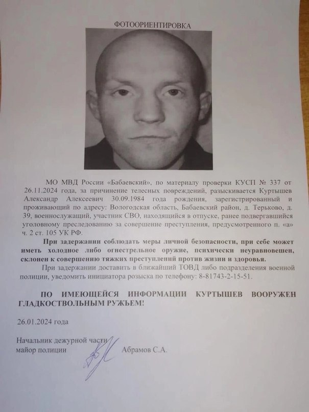 В Бабаевском городском округе Вологодской области полицейские разыскивают вернувшегося в отпуск участника войны в Украине Александра Куртышева, которого подозревают в причинении тяжкого вреда здоровью человека. Ориентировку на него опубликовала глава Кадуйского округа Светлана Грачева.