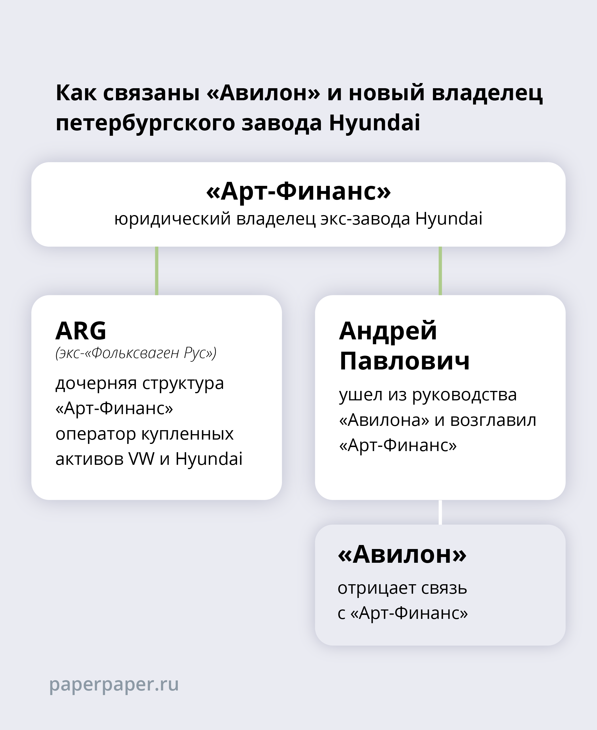 В AGR заявили, что намерены «активно развивать производство, чтобы поставлять российским покупателям надежные, доступные и комфортные автомобили». Представители «Авилона» не ответили на запросы «Бумаги» о связи с «Арт-Финанс», судьбе петербургских рабочих завода Hyundai и планах по выпуску новой продукции на предприятии.