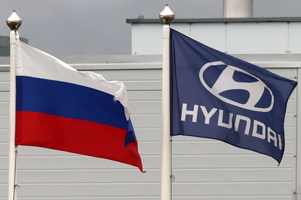 Флаги России и компании Hyundai у завода «Хендэ Мотор Мануфактуринг Рус» в Санкт-Петербурге. Александр Демьянчук / ТАСС