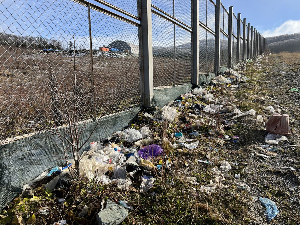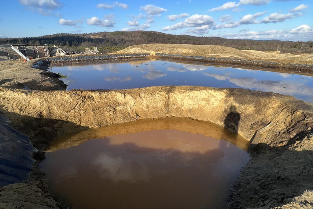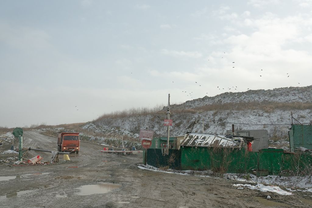 На фоне припорошенного снегом Майорского горного массива, где расположен "Известковый", куча разлетающегося мусора. Ее подпирает сеточное ограждение, машины привозят новые порции отходов и пытаются выровнять свалку. Перед ней два бассейна с жидкостями. В первом скапливаются осадки, в другой стекает блестящий фильтрат, который переливается через край и расползается по территории полигона. Рядом – небольшие кучки с отсортированным металлом и стеклом.