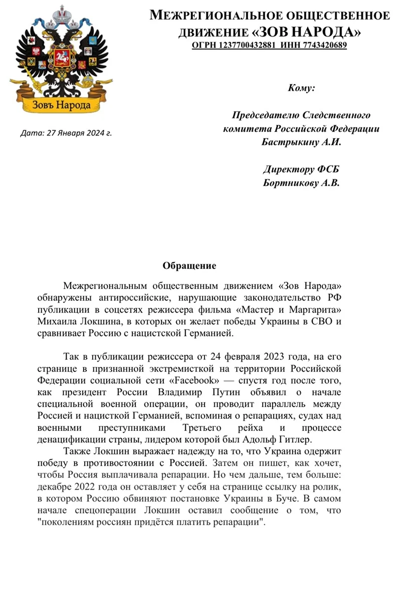 Движение «Зов Народа» «не стало терпеть вольготное положение русофоба Локшина» и призвало главу Следственного комитета Александра Бастрыкина и главу ФСБ Александра Бортникова возбудить уголовное дело против Локшина за «фейки» о российской армии, внести его в список экстремистов и террористов и ограничить заработок в РФ. Отдельно активисты предложили не выплачивать режиссеру дивиденды с фильма «Мастер и Маргарита».