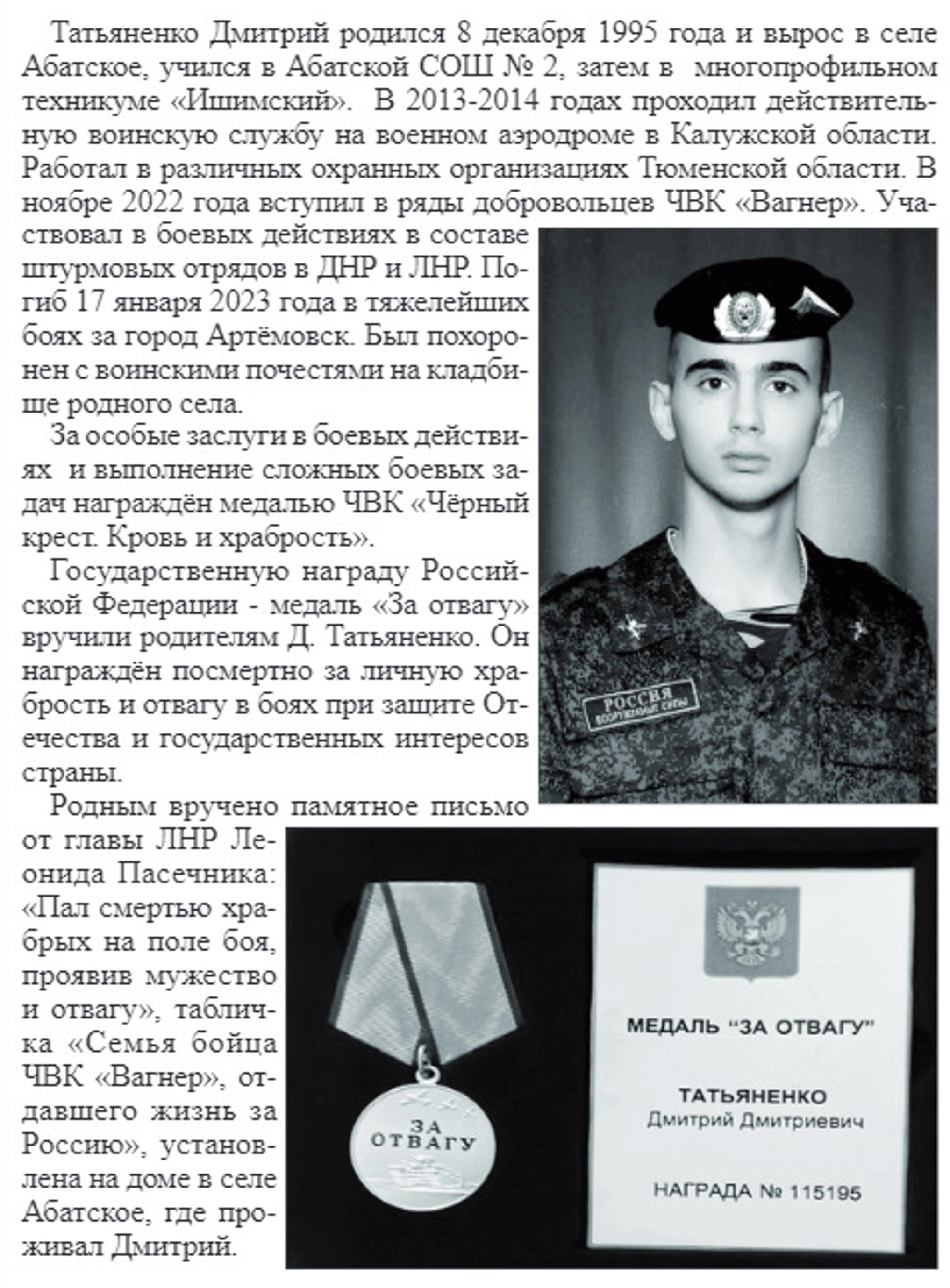 17 января 2023 года местная газета напечатала, что Дмитрий Татьяненко погиб под Артемовском. Его похоронили с воинскими почестями в Абатском. Посмертно наградили медалью "За отвагу".