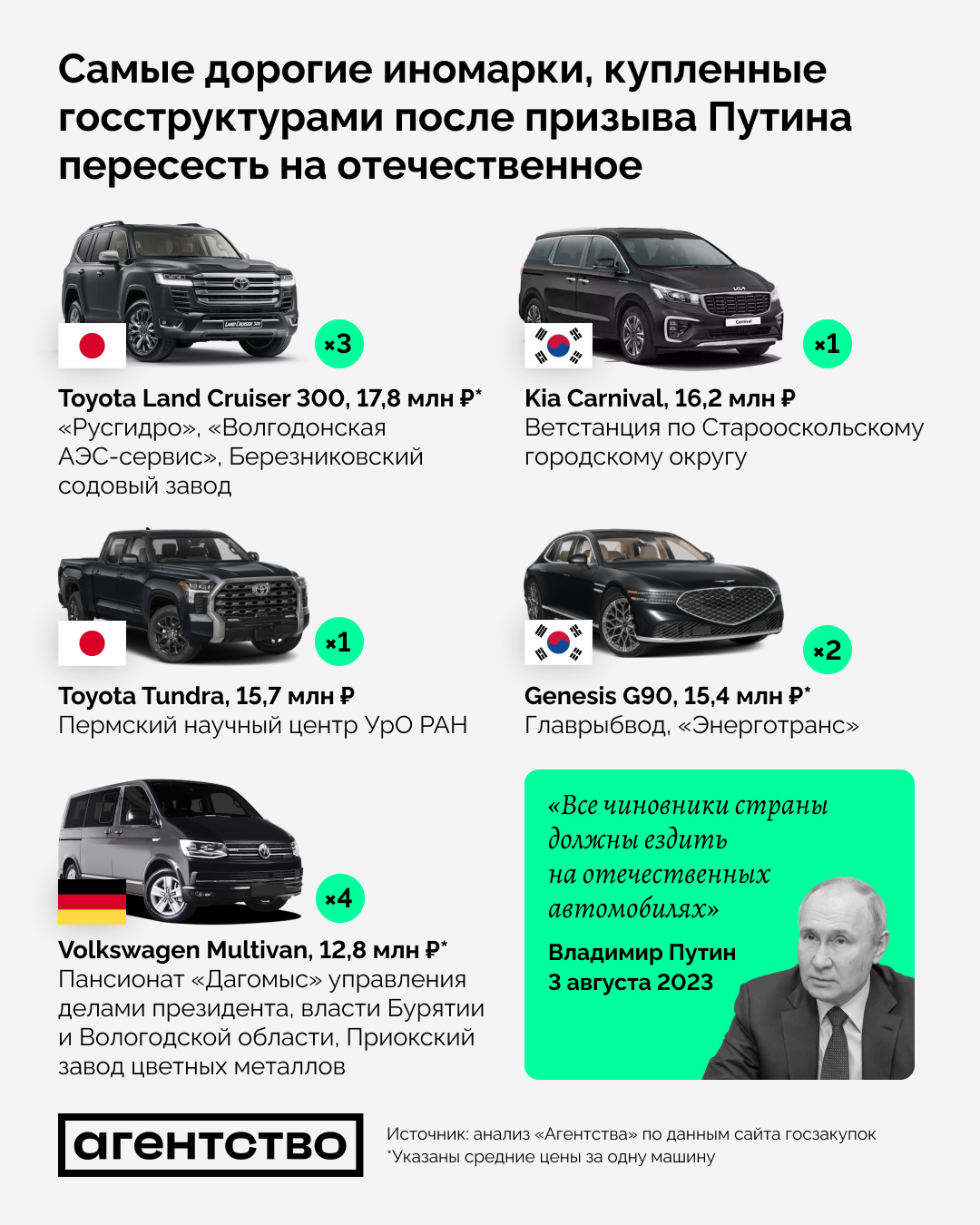 Комплекс «Дагомыс» управления делами президента не единственная госструктура, осмелившаяся закрыть глаза на требования президента. Согласно анализу «Агентства», органы власти, госучреждения и компании с госучастием с 3 августа по 31 декабря 2023 года купили 1041 иномарку общей стоимостью 3,46 млрд рублей. Из них только 64,2%, или 668 машин (стоимостью 1,8 млрд рублей), – это автомобили, которые рекомендовал покупать Минпромторг. Большая часть купленных машин – это бюджетные седаны и кроссоверы, средняя цена одной машины – 2,7 млн рублей.