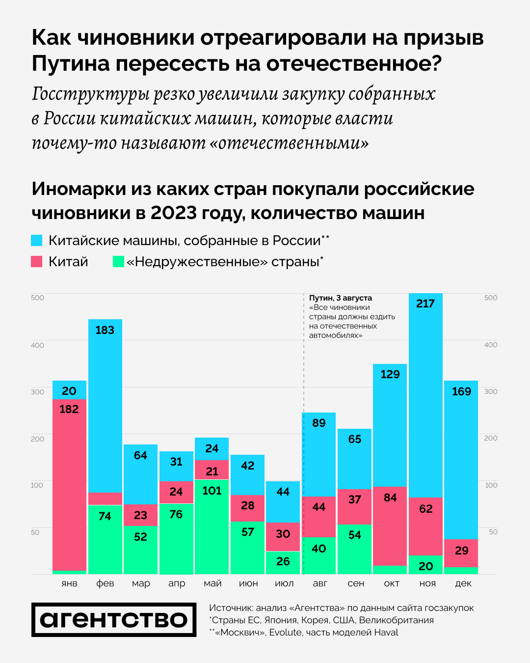 Согласно анализу «Агентства», на закупке машин из «недружественных» стран слова Путина сказались не сразу – в августе и сентябре госструктуры купили их даже больше, чем за предыдущие два месяца (94 против 83). Ситуация начала меняться в октябре, когда Минпромторг опубликовал список рекомендованных к покупке машин. За следующие три месяца госструктуры приобрели лишь 49 западных иномарок – меньше, чем за один сентябрь (54).