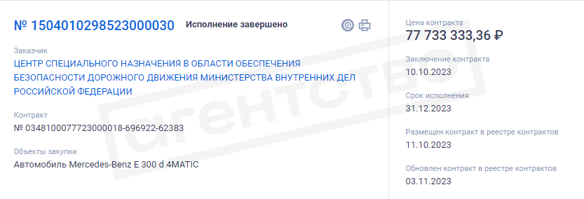Самую массовую закупку премиальных машин брендов из «недружественных» стран провел Центр спецназначения в области обеспечения безопасности дорожного движения МВД РФ. Уже после выхода рекомендаций Минпромторга центр купил сразу восемь Mercedes-Benz E 300 d 4MATIC, потратив на это 77,7 млн рублей (каждая машина обошлась в 9,7 млн). Поставщиком стала компания «Мерседес-бенц Рус» — бывшая «дочка» немецкого концерна.