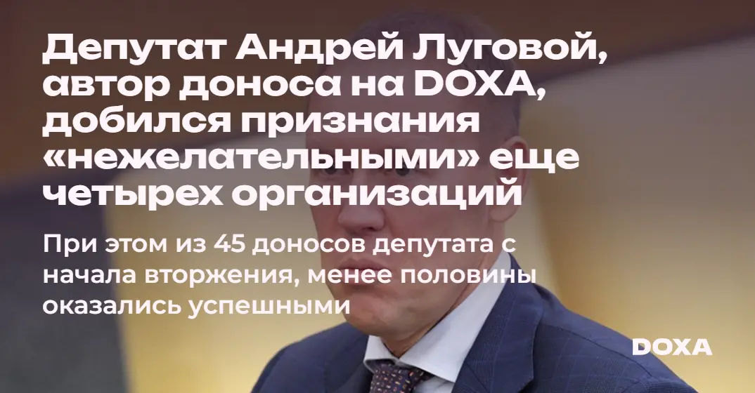 Кроме DOXA, по доносам Лугового «нежелательными» организациями были признаны Центрально-Европейский Университет в Вене, «Настоящая Россия», основанная Борисом Акуниным и экономистом Сергеем Гуриевым, активистская организация «Антивоенный комитет России», аналитический центр The Center for European Policy Analysis.