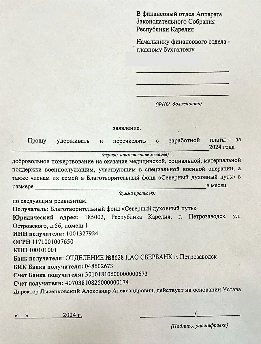 Карелия: в заксобрании сотрудникам прислали бланки для "пожертвования участникам СВО"