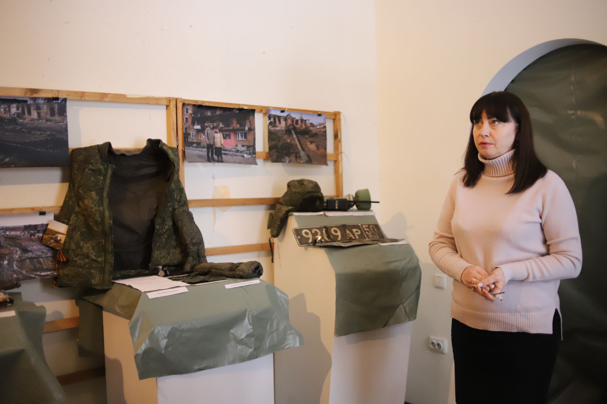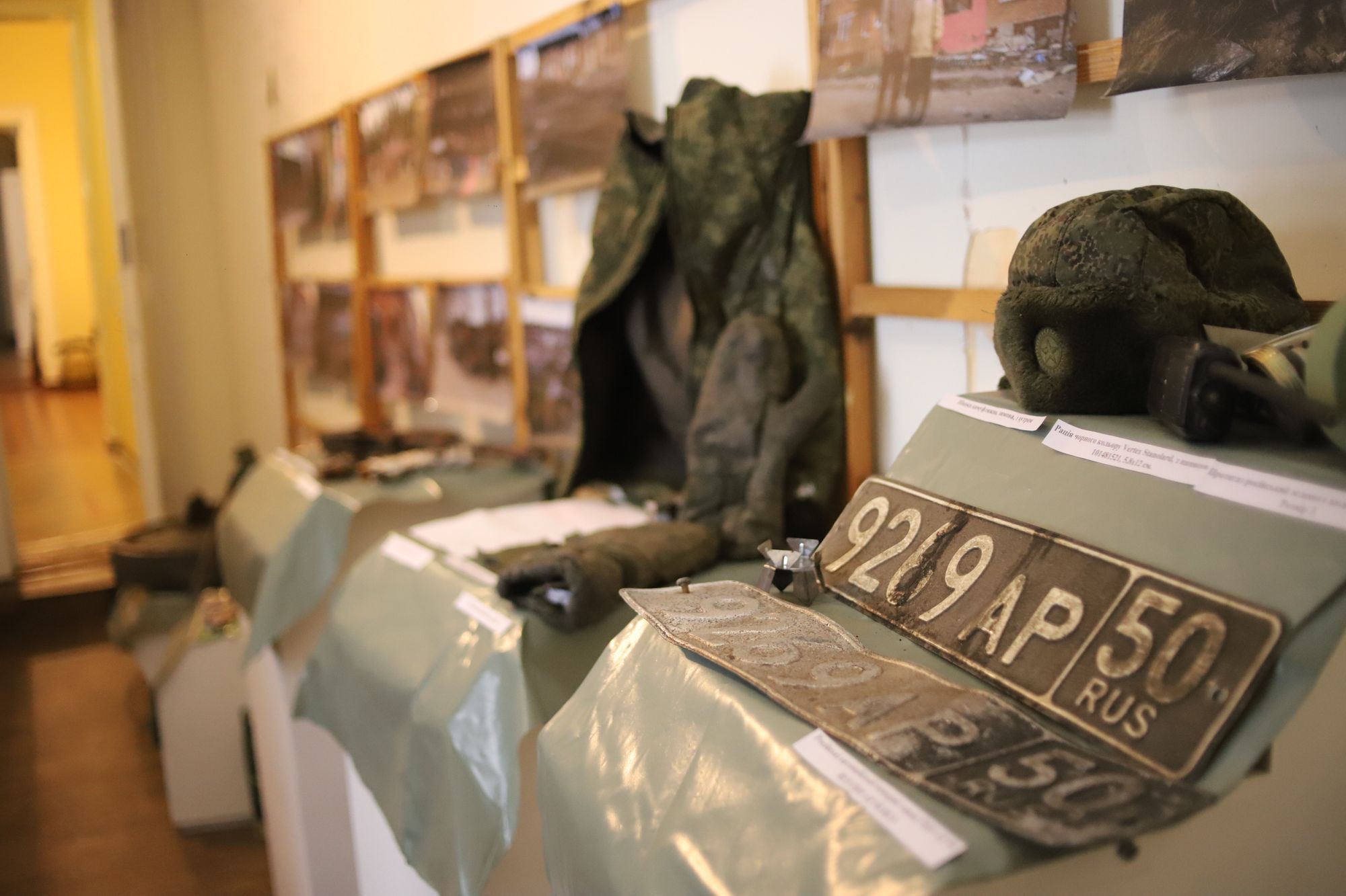 "Это совсем небольшая коллекция, потому как не все вещи нам сейчас можно принимать и хранить в музее. Поэтому, несмотря на то, что у нас были активные боевые действия, у нас не экспонируются, например, фрагменты оружия", - рассказывает Алина Толстых, и. о. директора Музейно-выставочного центра "Тростянецкий".
