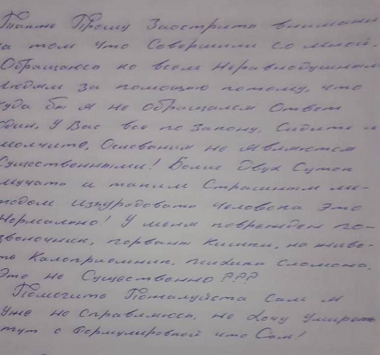Письмо заканчивается словами: "У меня поврежден позвоночник, порваны кишки, на животе калоприемник, сломана психика. Помогите, пожалуйста, сам я уже не справляюсь. Не хочу умирать тут с формулировкой, что Сам".