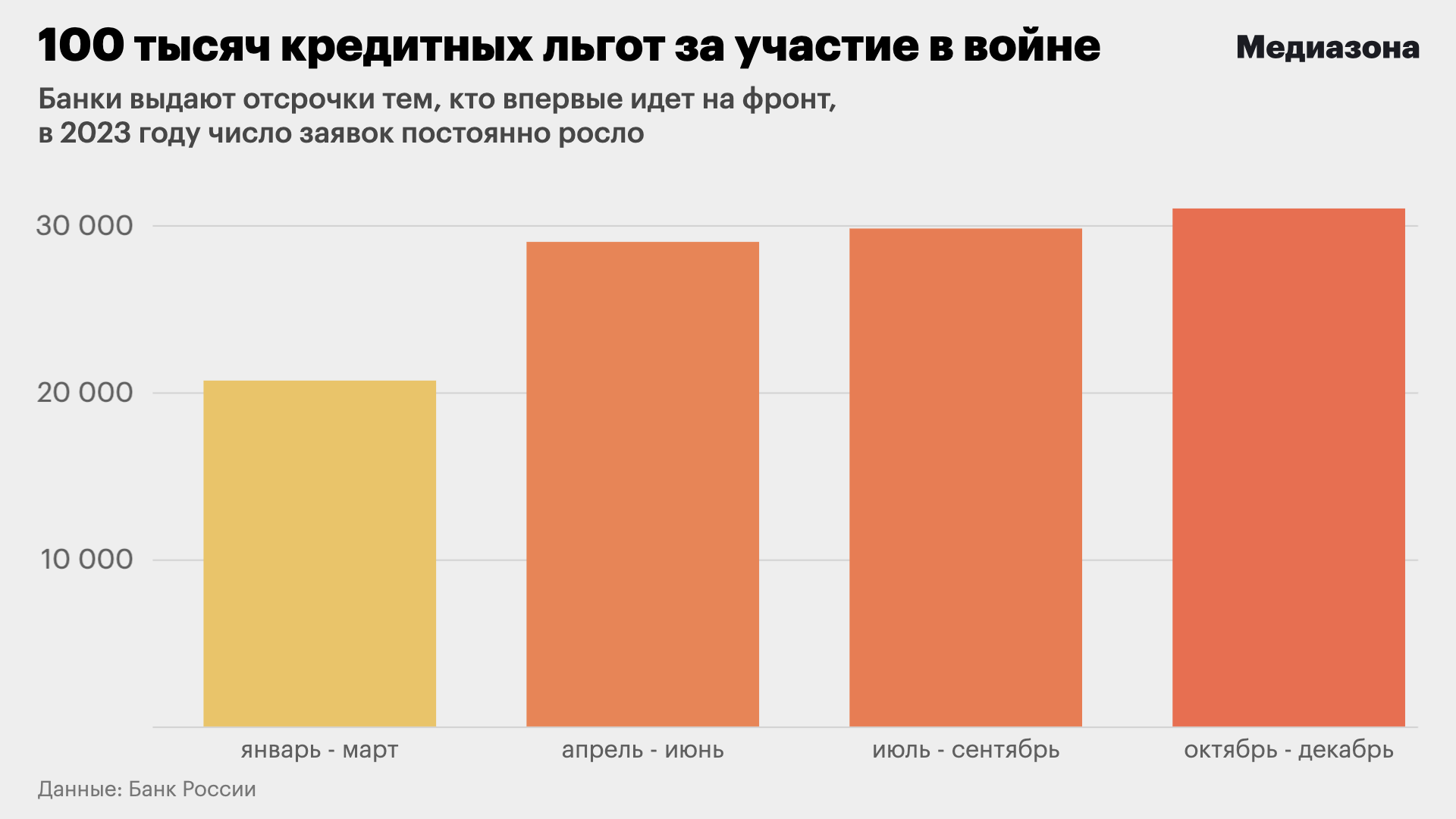 Количество новых заявок на получение «фронтовых» льгот стабильно росло, в четвертом квартале их была уже 31 тысяча. Всего с начала мобилизации в сентябре 2022 года отсрочками воспользовались более 278 тысяч военных.