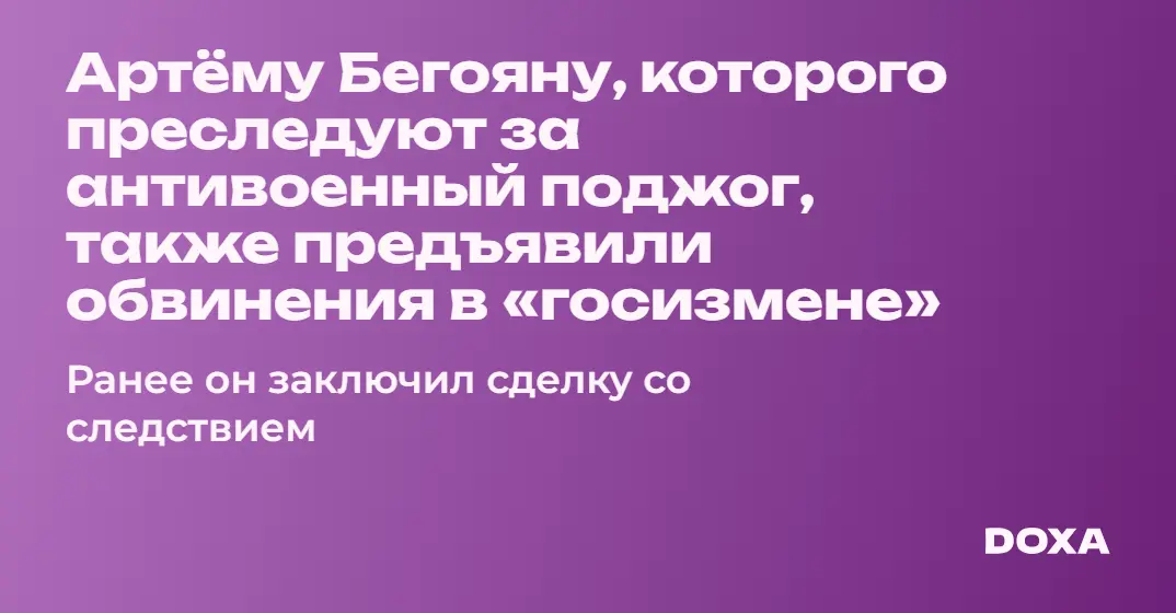 Артёму Бегояну, которого преследуют за антивоенный поджог, также предъявили обвинения в «госизмене»