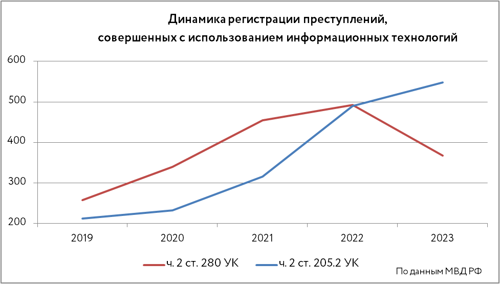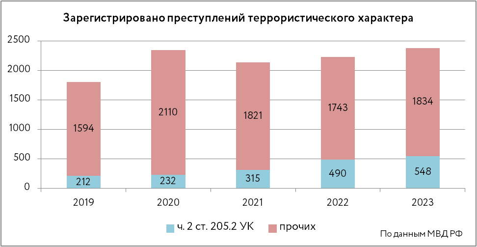 Выросло число преступлений, квалифицированных как публичное оправдание терроризма, совершенное с использованием информационно-коммуникационных технологий (т. е. ч. 2 ст. 205.2 УК). Таких преступлений в 2023 году было зарегистрировано 548 (+11,8 %), из них 282 выявили сотрудники ФСБ, 239 — МВД, семь — СК.