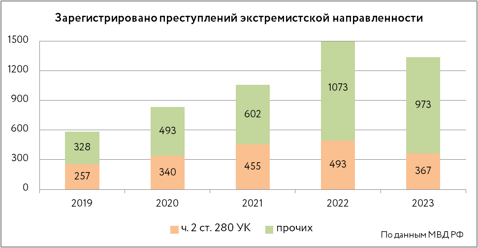 В 2023 году продолжился рост числа зарегистрированных преступлений об оправдании терроризма с использованием интернета. Число зарегистрированных преступлений экстремистской направленности сократилось — по сравнению с рекордным 2022-м.