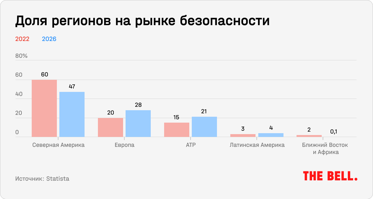 Северная Америка, пионер в развитии информационных технологий, ожидаемо доминирует и в этой сфере (см. график ниже). На ее долю приходится более 60% мирового рынка кибербезопасности.