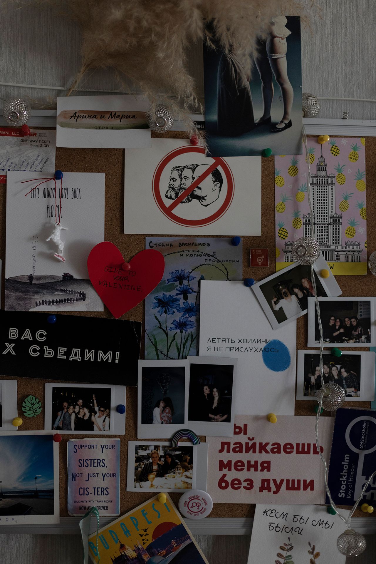 Мария: «Я увидела, как в бар зашла абсолютно прекрасная девушка, и поняла, что это та Арина, которая с прикольным стилечком оставляет комменты в «Лесбийском Лобби». Но тогда я к ней не подошла. Все закрутилось, когда после принятия закона о запрете ЛГБТК-пропаганды [в ноябре 2022 года] мой друг решил поддержать сообщество и собрать фотографии целующихся квиров. Моя девушка отказалась участвовать и сказала, что ей будет норм, если я найду кого-то другого для этого стейтмента. Я удивилась, но запостила в сторис запрос, на который отреагировала Арина. Мы стояли и целовались в баре под елочкой, на которой висел шарик с надписью «Хуй войне». Это был поцелуй для социального проекта, но произошла какая-то магия, что-то щелкнуло внутри. Я бережно рассталась со своей девушкой и начала встречаться с Ариной. Я сразу поняла, что это не проходная история, а серьезные отношения».