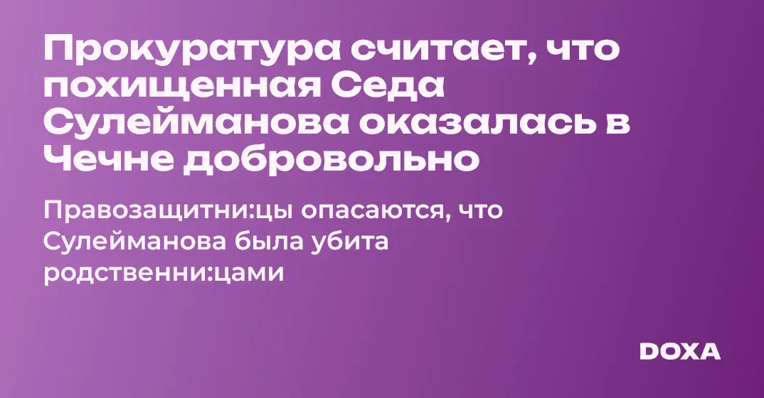 Прокуратура ответила правозащитни:цам из «Кризисной группы СК SOS» по поводу похищения Седы Сулеймановой ее родственни:цами из Чечни. По мнению ведомства, Сулейманова якобы добровольно поехала в Грозный после вызова на допрос и уехала к семье.