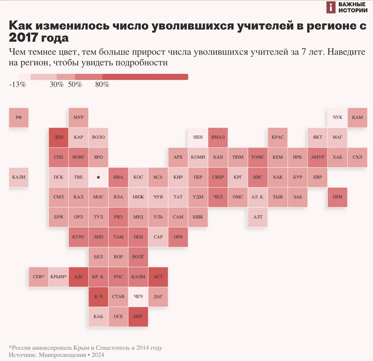 Хуже всего ситуация с увольнениями учителей изменилась в Астраханской области — за семь лет количество ушедших преподавателей увеличилось с 1 тысячи до 2,8 тысячи человек, пишут «Важные истории». По их данным, также с 2017 года резко увеличилось количество учителей, уволившихся из школ Адыгеи, Ленинградской области, Ингушетии и Карачаево-Черкесии. При этом реже увольнения учителей стали случаться в Чечне, Чукотском и Ненецком автономных округах, говорится в материале.