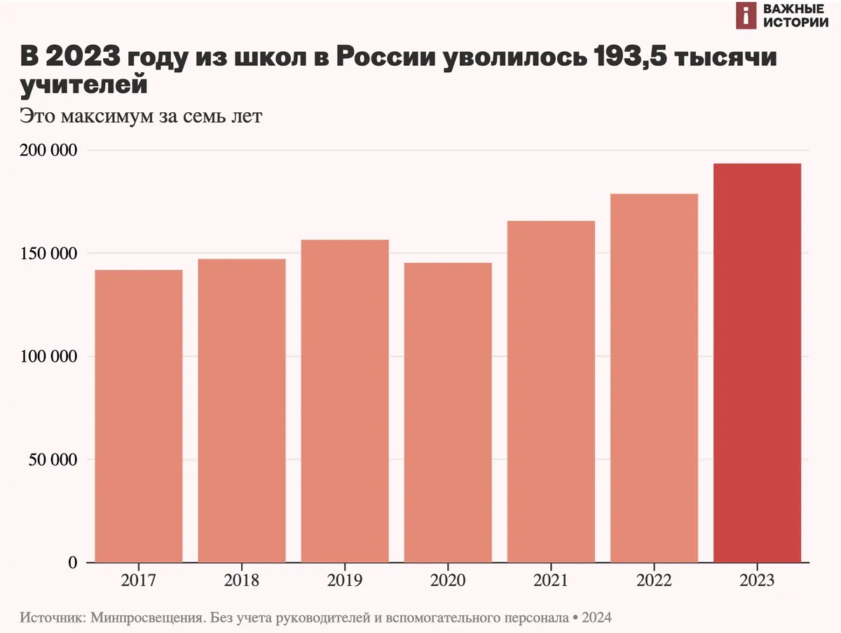 Как выяснили «Важные истории», за последние семь лет количество учителей, увольняющихся из школ, выросло более чем на треть — если в 2017 году их было 141,8 тысячи человек, то в 2023 году — уже 193,5 тысячи. Если считать сотрудников, которые занимали руководящие и вспомогательные посты в учебных заведениях, количество уволившихся школьных работников за 2023 год составляет 316,3 тысячи человек.