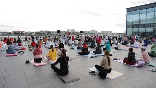 Международный день йоги на крыше IT-парка Башира Рамеева, открытого в Казани в 2022 году. Каждый вечер на здание парка в центре города проецируется флаг Татарстана, который сменяется флагом России.