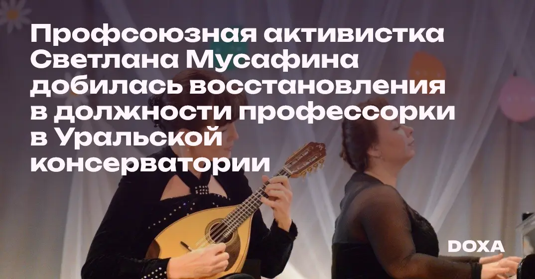 Председательница первичной организации профсоюза «Университетская солидарность» Светлана Мусафина в суд добилась восстановления в должности профессорки Уральской государственной консерватории в Екатеринбурге. Мусафина связывает свое увольнение с профсоюзной деятельностью.