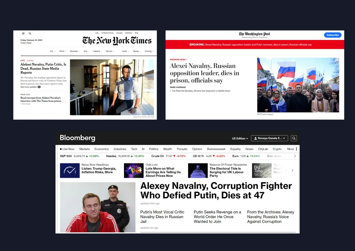 Новость о том, что главный оппозиционер Путина умер в тюрьме, появилась на главных полосах американских The New York Times, The Washington Post, Bloomberg.