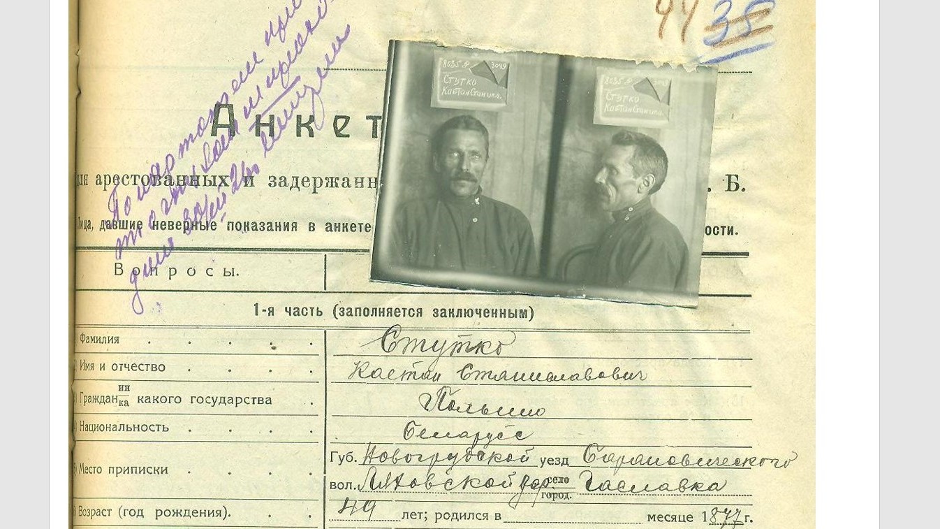 – Это стало огромной травмой для семьи, – говорит Антонина. – Его вдову парализовало. Насколько понимаю, в семье о расстрелянном прапрадеде вообще не говорили. Его дочка сменила польское имя Мальвина, стала Марией. Дочь Марии – моя бабушка Любовь, которая родилась в 1947 году в Красноярске, а скончалась несколько дней назад. Прапрадеда реабилитировали в 1956 году, но даже на моей памяти разговоры о трагической судьбе прапрадеда в семье были полузапретные. Моя бабушка родилась через десять лет после расстрела моего прапрпрадеда, у неё были о нём только обрывочные и неточные сведения. Я первая в роду, кто этой историей заинтересовался. Сначала обратилась к базе данных "Мемориала", потом мне удалось получить копии некоторых материалов дела из архивов ФСБ. В этих материалах есть тюремная фотография прапрадеда.