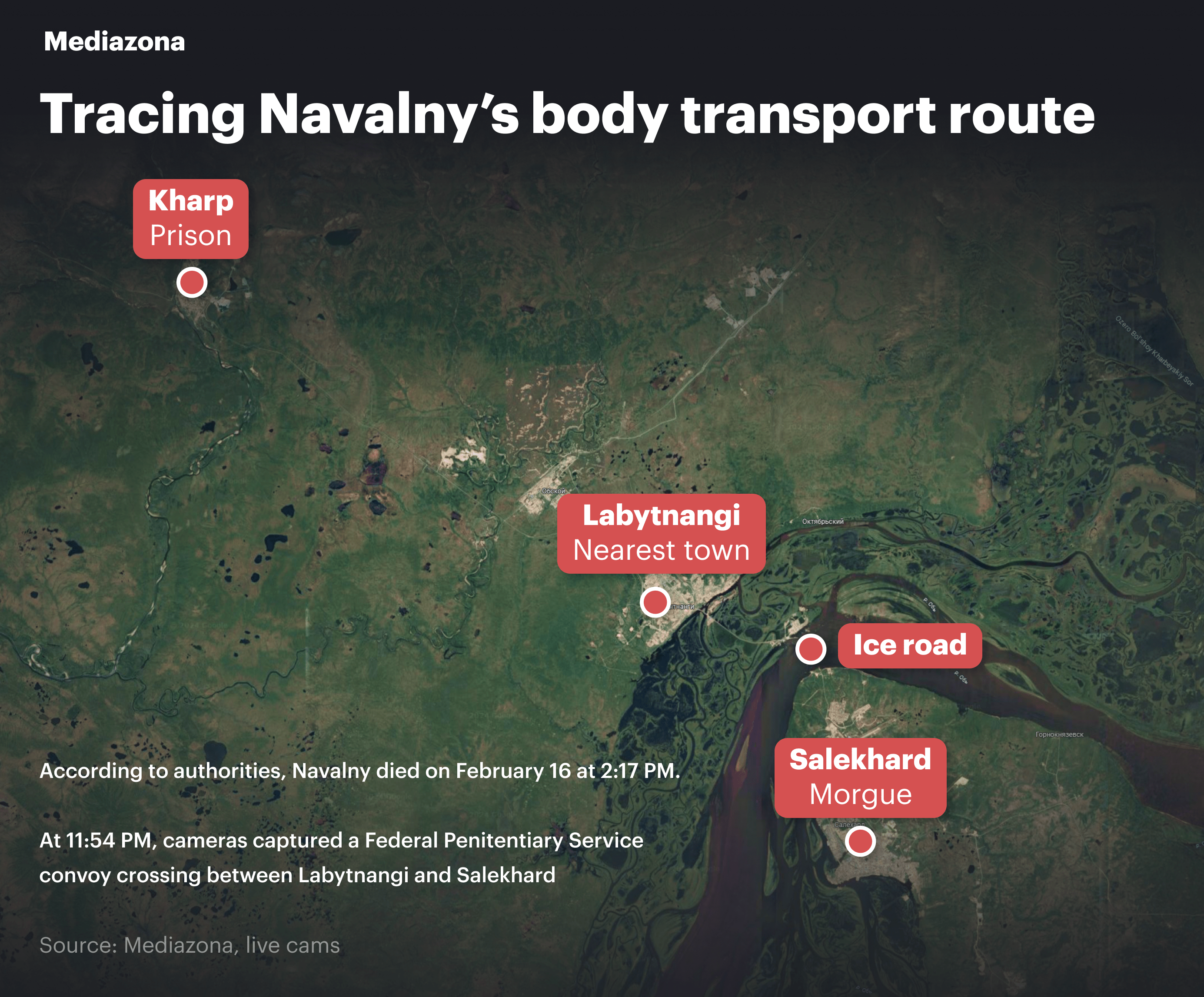 The colony in Kharp, where Navalny was held, and the nearest town, Labytnangi, are located on the left bank of the Ob river. Salekhard, the capital of the Yamalo-Nenets Autonomous Okrug, is on the right bank. There is no bridge between Labytnangi and Salekhard across the 1,5-mile river: in summer, a ferry operates, and in winter, an ice crossing is established. Excluding helicopter transport, the ice road is the only route between IK-3 and the Salekhard morgue.
