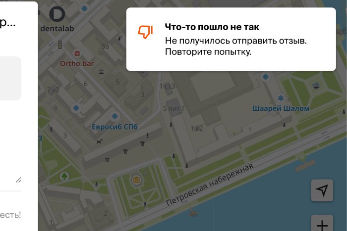 При попытке опубликовать комментарий 2ГИС выдает уведомление об ошибке и предлагает написать комментарий заново, проверила «Бумага» с разных аккаунтом в сервисе.