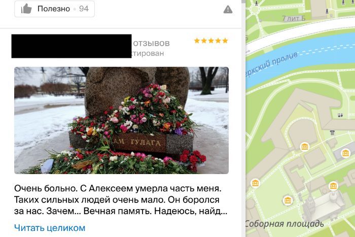 Детали. 2ГИС не позволяет написать отзыв о памятнике жертвам политических репрессий на Воскресенской набережной и Соловецком камне на Троицкой площади, куда петербуржцы несли цветы и свечи в память о Навальном.