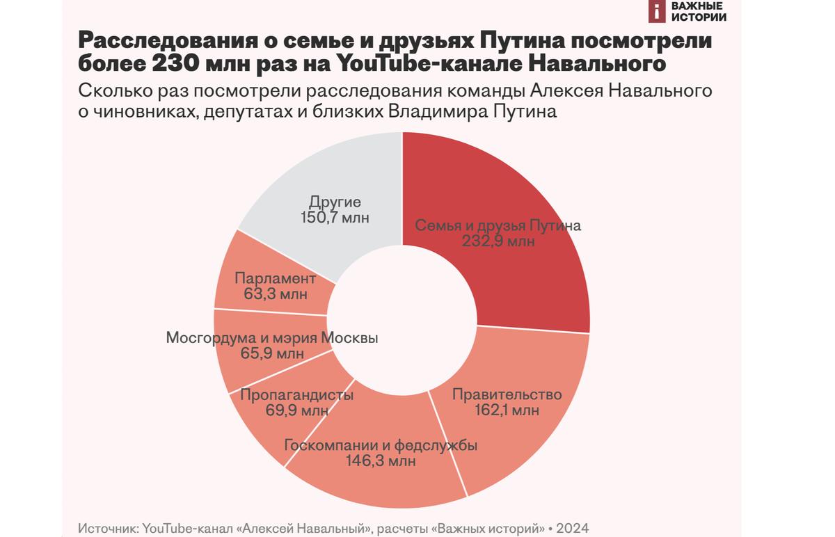 За 10 лет все 505 выпусков на канале «Алексей Навальный» набрали 1,5 млрд просмотров. Большую часть из них — 892 млн — собрали 146 расследований.
