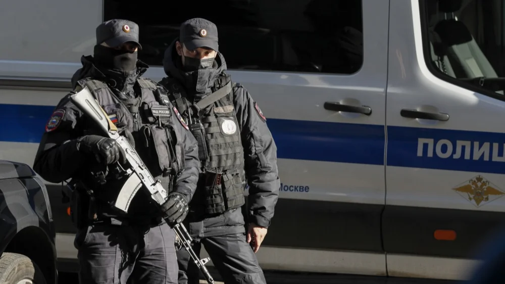 Armed police officers on duty outside a Moscow court during the trial of Oleg Orlov, the chairman of human rights group Memorial, in October. Photo: EPA-EFE/YURI KOCHETKOV