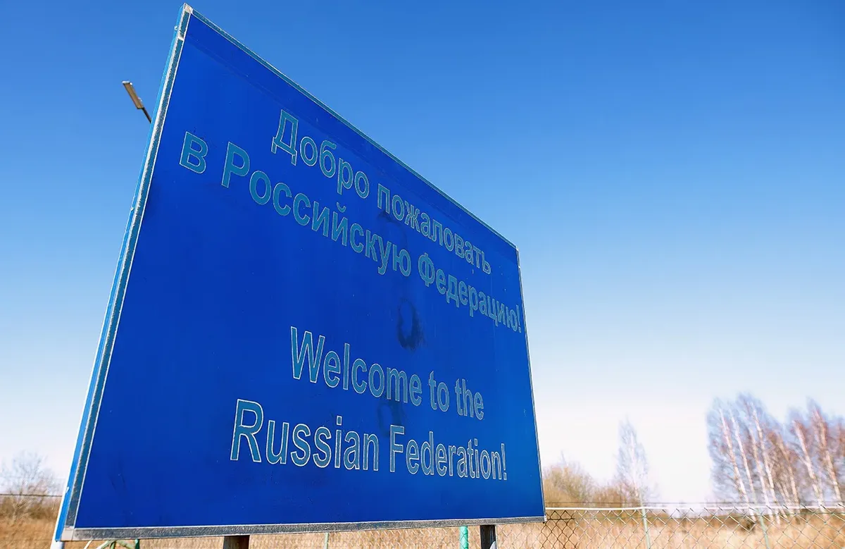 Дорожный знак «Добро пожаловать в Российскую Федерацию» на въезде на территорию России, Калининградская область, 17 марта 2022 года. Фото: Александр Подгорчук / Коммерсантъ / Sipa USA / Vida Press