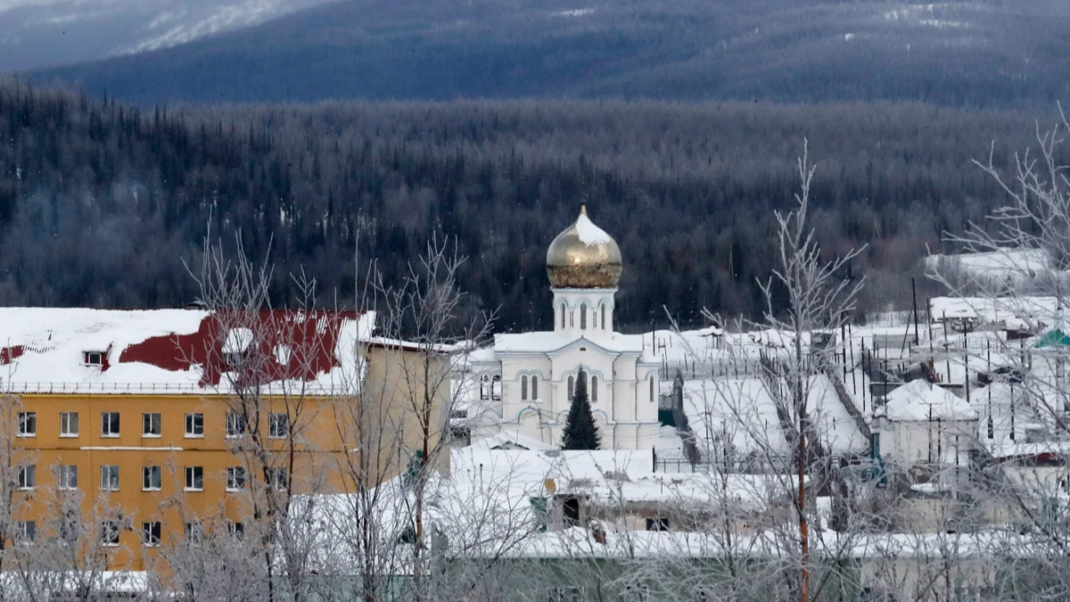 Вид на исправительную колонию №3 и церковь на территории колонии в посёлке Харп, 18 февраля 2024 года. Фото: Анатолий Мальцев / EPA-EFE