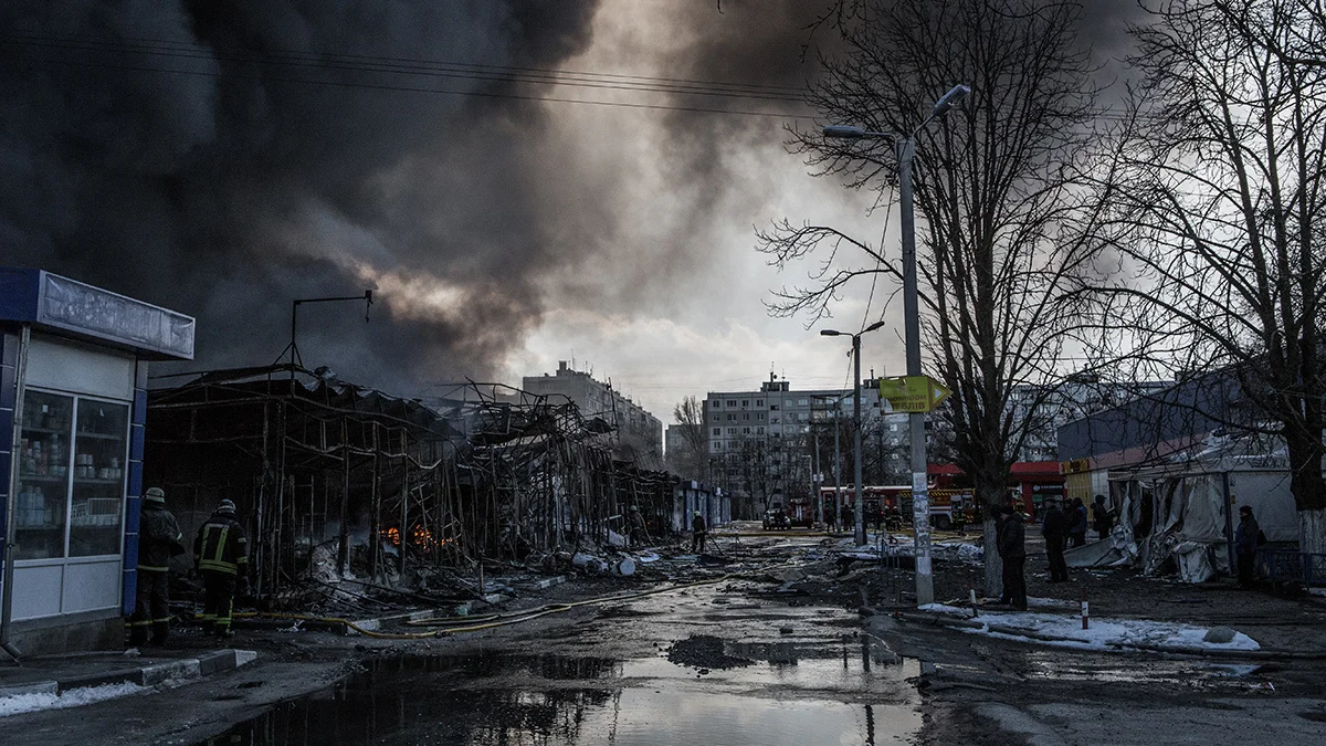 Дым от пожара на рынке в жилом районе Салтовка в Харькове после обстрела, Украина, 16 марта 2022 года. Фото: Andrea Carrubba / Anadolu Agency / Getty Images