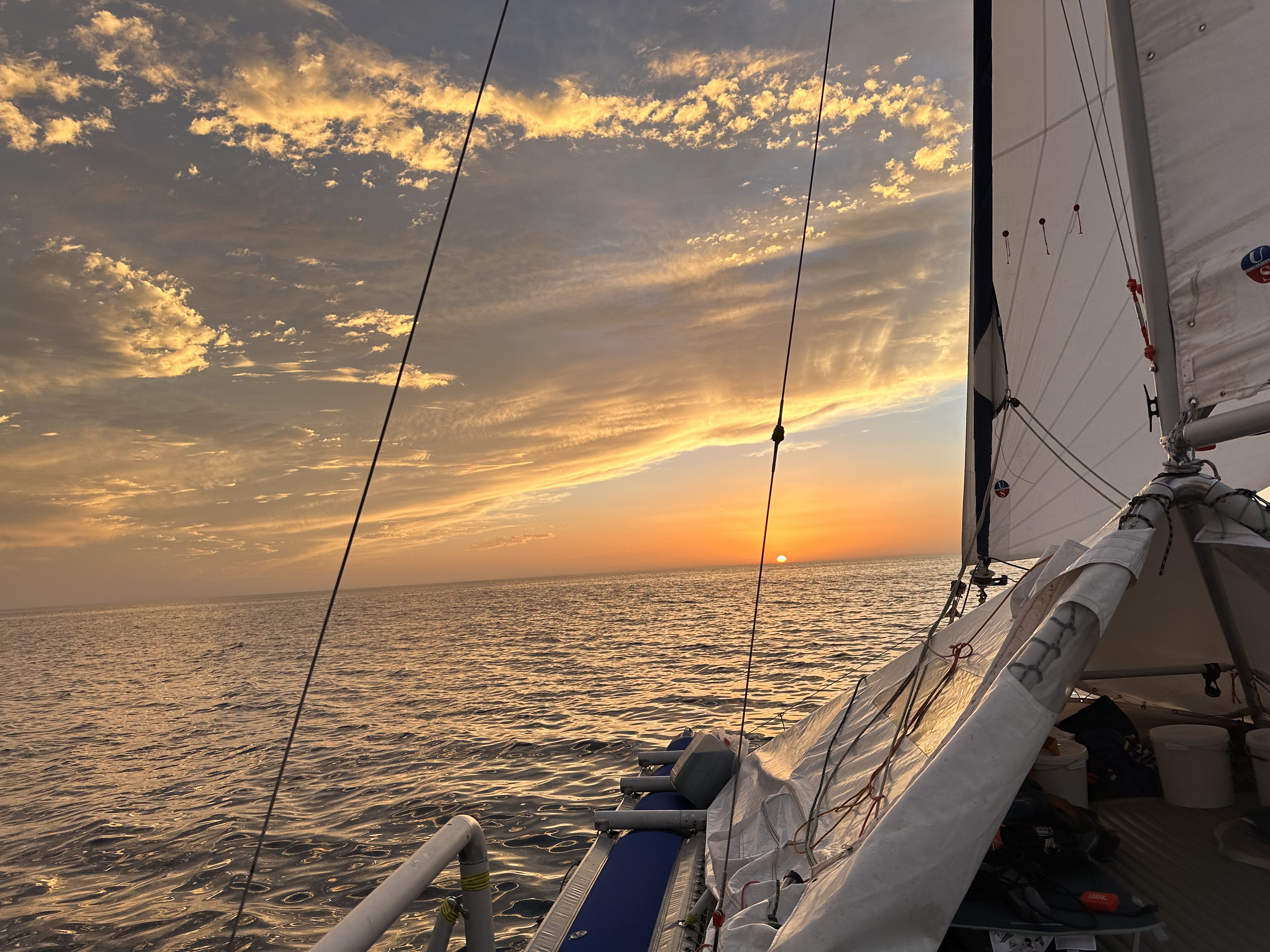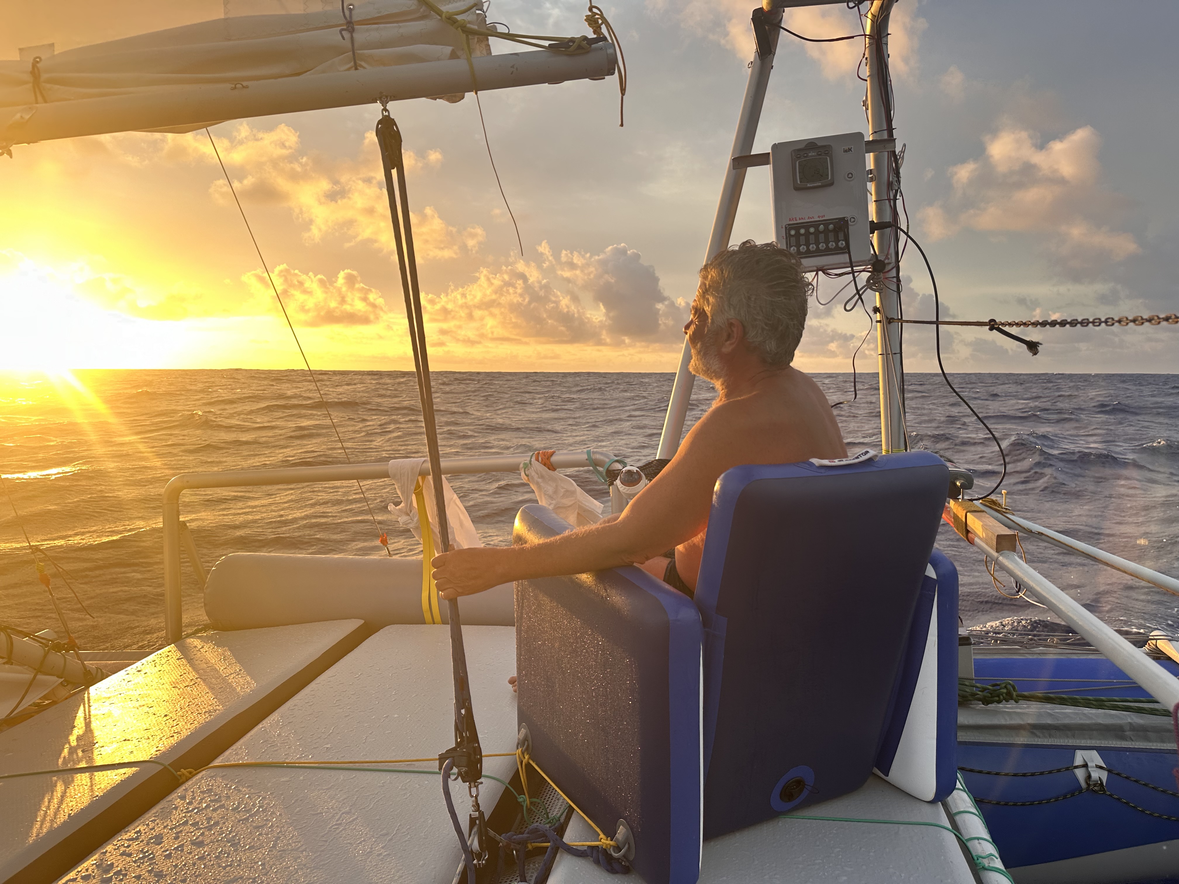 – Когда хорошие ветра, боковые, то управлять катамараном проще простого. А когда левентик, (положение, когда ветер по отношению к судну дует практически точно спереди – прим. С.Р.), то приходится идти галсами, это сложнее. Последние пять дней у нас был если не левентик, то бейдевинд (направление движения парусного судна при встречно-боковом ветре – прим. С.Р.) 30° к курсу, это еще сложнее идти. Ветер сменился на встречный, скорость упала, но мы все равно шли. Было нелегко: мы же не матерые моряки, мы начинающие. Я хоть и ходил уже месяц по экватору, но средний ветер тогда был 2-3 узла, очень слабый, поэтому никакого парусного опыта я не получил. И на этот раз нам пришлось очень стараться, чтобы справиться.