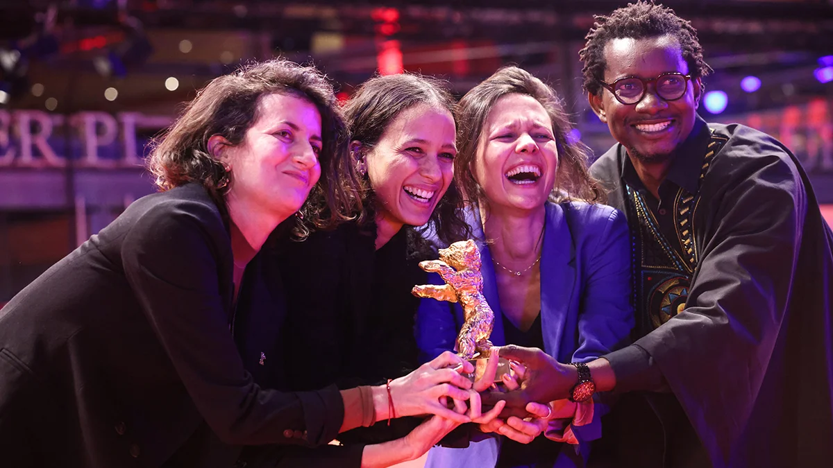 Джудит Лу Леви, Мати Диоп, Ив Робин и Фабакари Ассимби Коли с Золотым медведем за лучший фильм «Дагомея», Берлин, Германия, 24 февраля 2024 года. Фото: Clemens Bilan / EPA-EFE